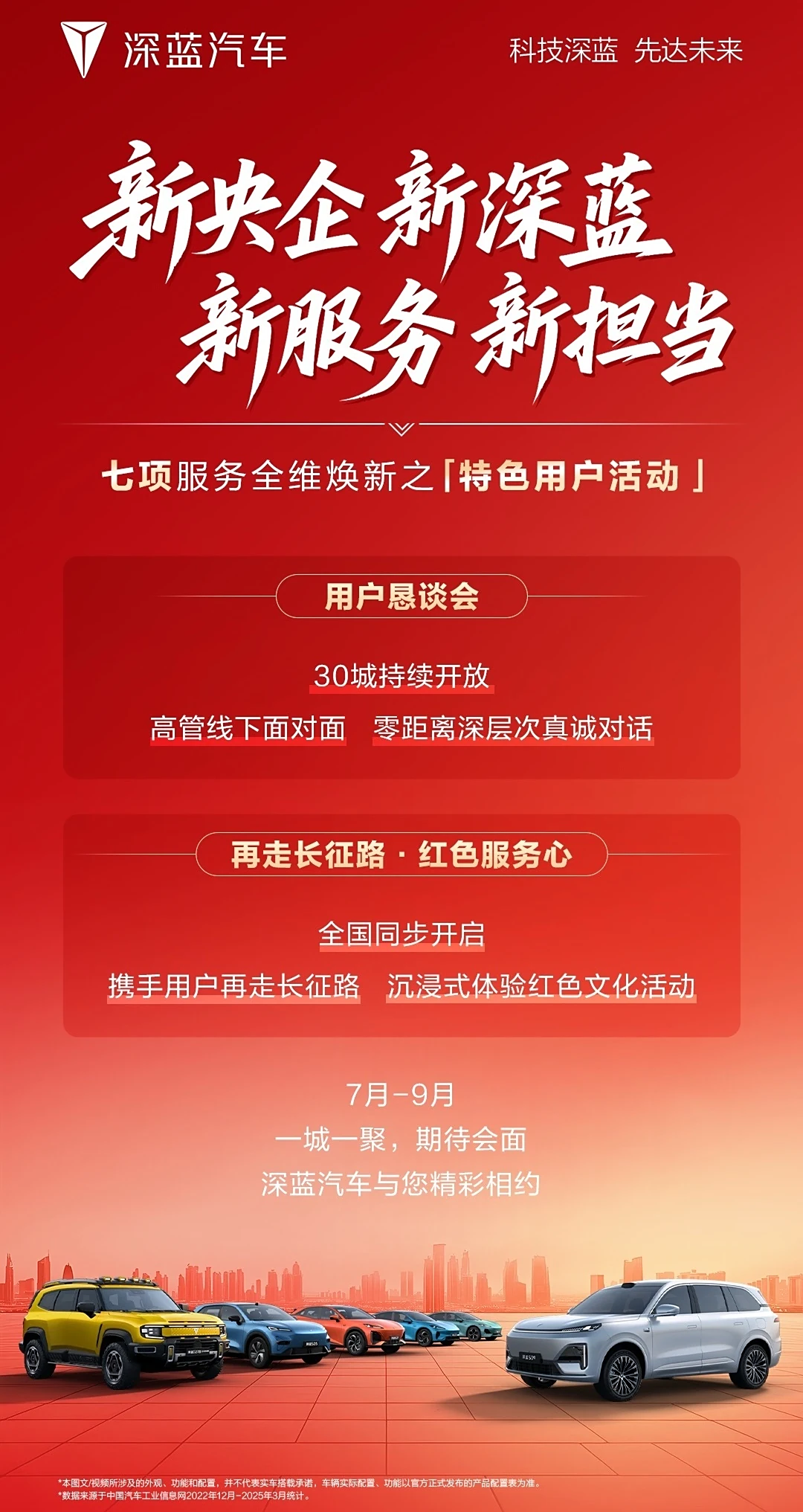 IT之家注意到,深蓝汽车官方今日还发文宣布,七项服务全维焕新,特色用户活动已同步开启,30 城持续开放高管线下面对面活动。